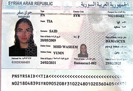 الاسم: تيا محمد وسيم سعيد الصفة: متطوعة إغاثة إنسانية الدولة: سوريا رﻗﻢ وﺛﻴﻘﺔ اﻟﺴﻔﺮ: N02180483 زﻣﺮة اﻟﺪم: A+ الجنس: أنثى |