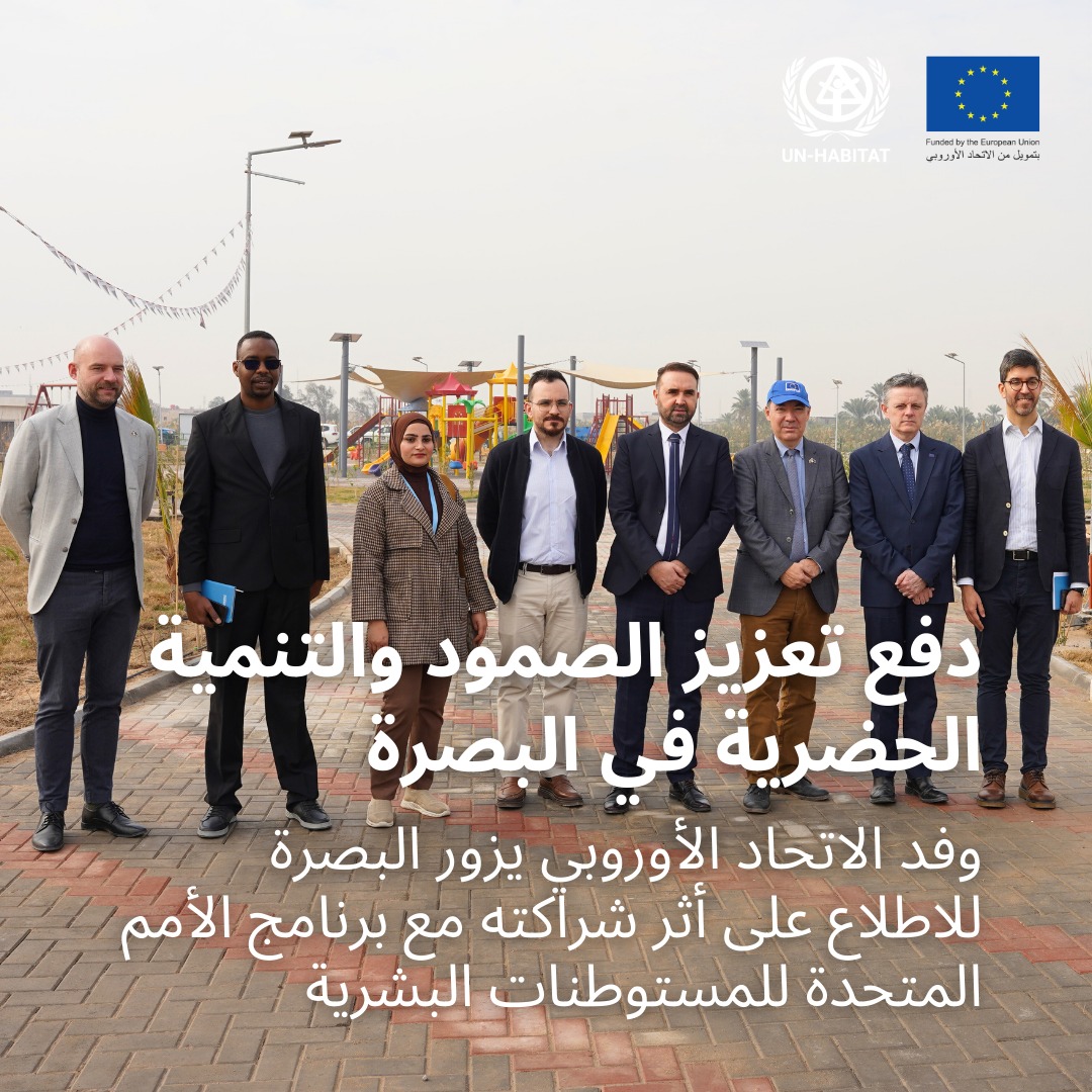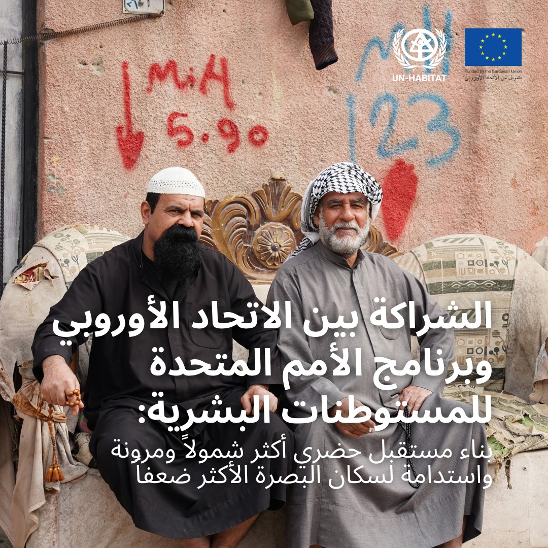 بدعم من الاتحاد الأوروبي، يتعاون برنامج الأمم المتحدة للمستوطنات البشرية والسلطات المحلية في البصرة لتعزيز جودة حياة السكان من خلال ترقية البنية التحتية في المناطق الحضرية، وزيادة الوصول إلى فرص العمل للسكان الحضريين المستضعفين، وتحسين صنع القرار القائم على البيانات وقدرات صانعي السياسات لإدارة المدينة.
